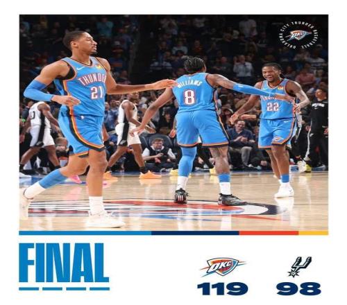 今日常规赛,雷霆119-98马刺。