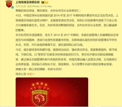 但是上海上港面对中国足协的处罚却完全相反,表示坚决拥护和全面接受,深刻认识到错误,并向受影响的球迷、合作伙伴以及社会各界表达歉意。