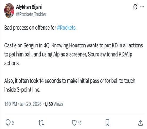 正如赛后火箭媒体人Alykhan Bijani所说:“火箭队的进攻发起烂透了,马刺用卡斯尔换防申京就直接破解了火箭队的挡拆进攻,因为所有人都知道他们一定会将球交给杜兰特。”