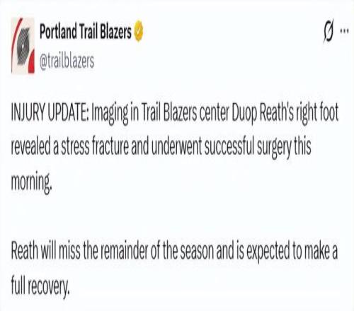 北京时间1月30日,开拓者官方更新伤情报告,杜普-里斯的右脚影像检查显示存在应力性骨折,并已于当地时间今日上午成功接受手术。里斯将缺席本赛季剩余的所有比赛,预计可以完全康复。另外,据开拓者记者报道,亨德森和韦斯利已进入康复的最后阶段,并且开始参与全队对抗训练。